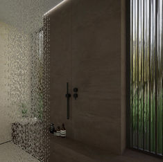 Punctul focal – elementul apă. Spațiu al purificării, cada coboară gravitațional, înlesnind legătura cu mineralul. Vitrajul amplu facilitează conectarea la mediul exterior într-o extensie a oglinzii de apă.